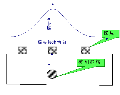 電磁感應原理鋼筋儀由主機(信號發(fā)射系統(tǒng)、信號采集系統(tǒng))和探頭組成。信號發(fā)射系統(tǒng)產(chǎn)生一定頻率的激勵信號激勵探頭,探頭感應被測鋼筋,輸出的信號經(jīng)信號采集系統(tǒng)轉(zhuǎn)換為數(shù)字信號,送入主機系統(tǒng)進行處理,判定鋼筋的位置和保護層厚度以及鋼筋的直徑,接收信號大小和鋼筋位置的相對關(guān)系如圖所示。